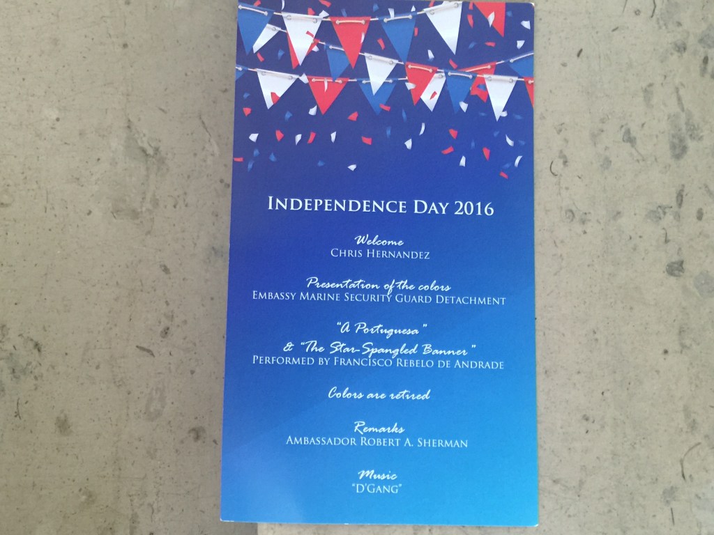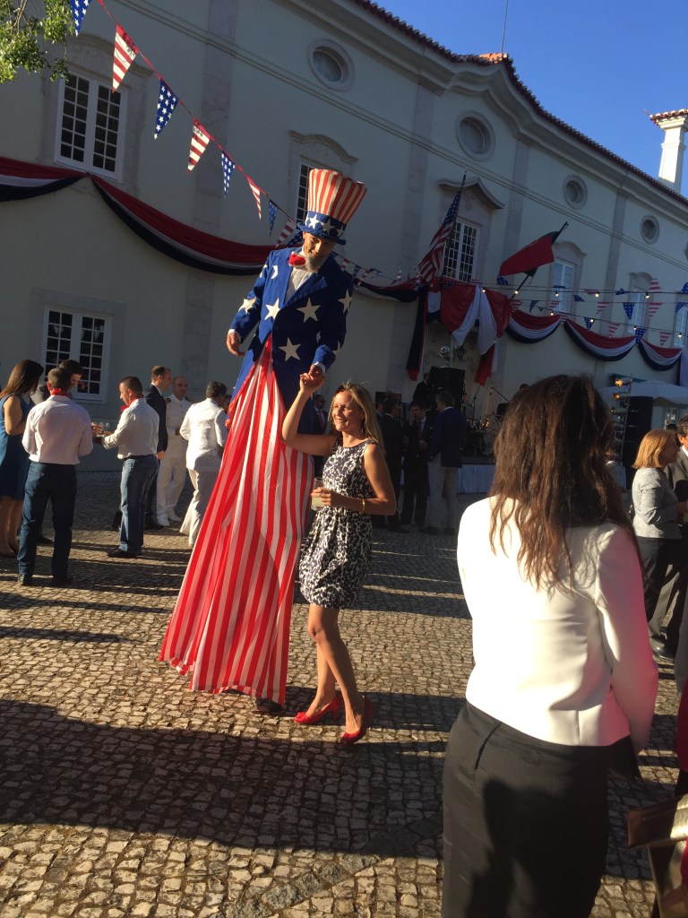 A Embaixada Americana em Portugal organiza, por norma, uma enorme celebracao. Houve um ano que estava em Portugal e o Embaixador Americano Allen Katz convidou-me para as suas celebracoes do dia da Independencia. Grandes celebracoes com muita seguranca, da policia, do servico secreto e seguranca privada. Localizada nas Avenida das Forcas Armadas, a Embaixada apresentou uma festa ao gosto americano onde nao faltaram os hot dogs, hamburgers, steaks, outras especialidade da culinaria Americana, gelados e a musica.. So para convidados e eram muitos.