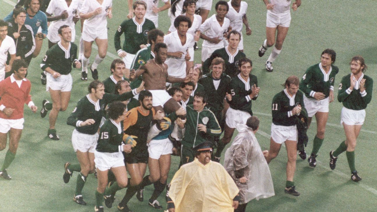 No dia 1 de Outubro de 1977, perante um estádio completamente esgotado, Pele disse adeus ao futebol. Um encontro atípico quando se defrontaram as duas equipas que ele representou. Do Brasil veio o Santos, que representou a grande parte da carreira e dos EUA os Cosmos com quem terminou a carreira. Jogou 45 minutos por cada equipa e os Cosmos venceram o encontro por 2-1.